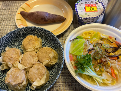 シウマイ、焼きいも、半額ヨーグルト、スーパーのチャンポン。