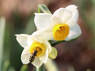 スイセンの蜜を吸うアブ。花に虫がやってくると、つい撮ってしまいます。